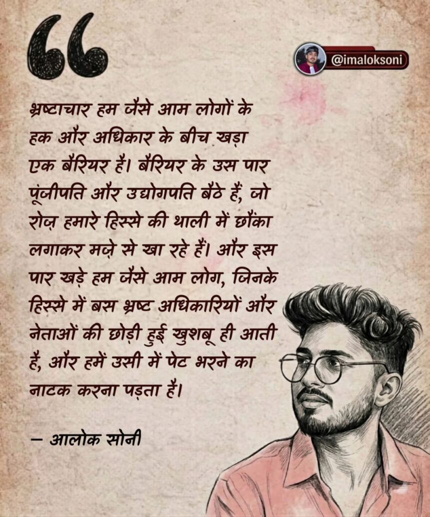 देखिए, सच कहें तो, सबसे कड़वी और शर्मनाक बात यह है कि हममें से ज़्यादातर लोग भ्रष्टाचार के खिलाफ तब बोलते हैं, जब हम खुद उसमें हिस्सा नहीं ले पाते। जब अपना काम पैसे या जुगाड़ से नहीं बनता, तब अचानक हमें ईमानदारी और न्याय याद आने लगता है। वरना मौका मिले तो वही काम हम भी कर लेते हैं। यही असली सच्चाई है, जिसे हम मानना नहीं चाहते।